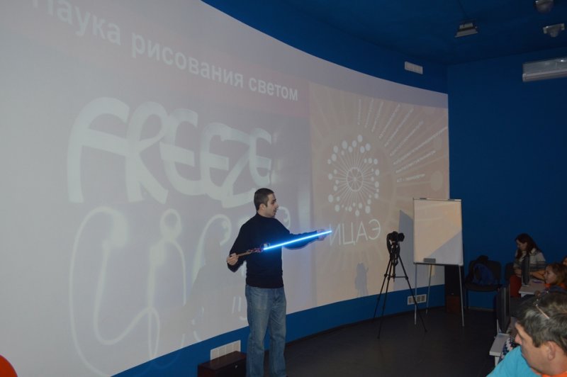 Денис Максимов, известный смоленский фотограф, рассказал «академикам» о том, что такое фризлайт и как его приручить. Оказывается, при помощи фризлайта можно создавать рисунки, используя различные источники света. Научились это делать еще в 40-х годах прошлого столетия, и первым, кто создал осмысленный рисунок светом, стал художник Пабло Пикассо. Сегодня с помощью фризлайта создают не только великолепные рисунки, но и разные логотипы и надписи.